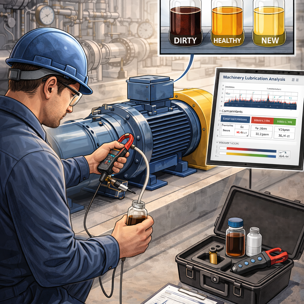 Oil and grease analysis to assess contamination, wear particles, and lubricant condition for optimized lubrication practices.